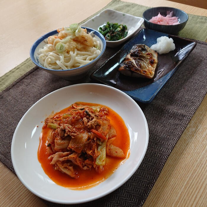 今日の汁物は海老と玉ねぎのかき揚げうどんです!