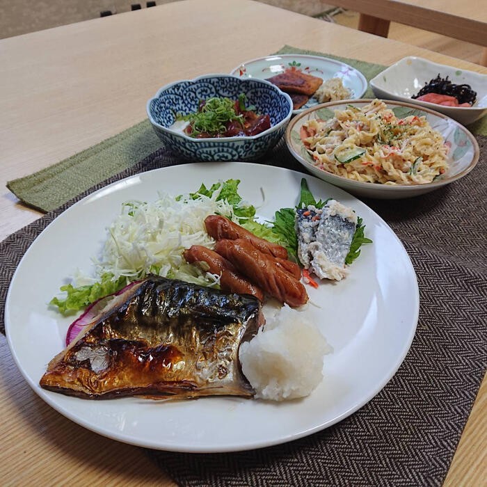 おかず三種盛りにさば、飯寿司、ウインナーと一緒に盛り合わせています。