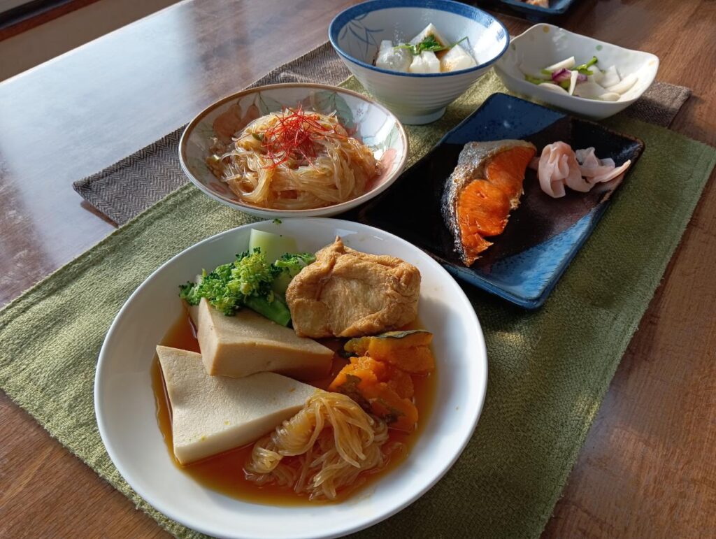 玉子巾着、カボチャ、小巻白滝、高野豆腐を煮つけ、あしらいに