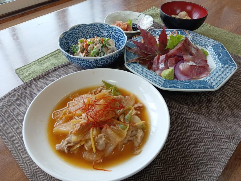 背の身より腹身ですので脂が乗っていて美味しいです。豚バラ薄切りと大根イチョウ切り、