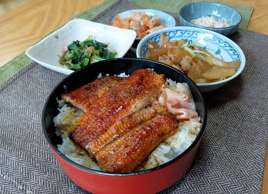 今日のメインは贅沢にうな丼です!