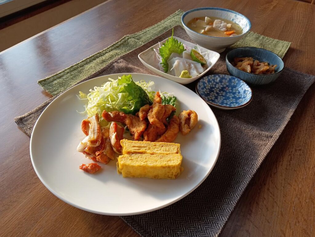 おかず盛り合わせは、スティックチキンの唐揚げ、紅鮭ハラス焼き、出汁巻き卵の