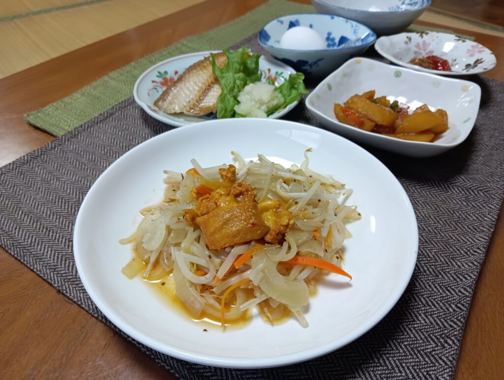 身離れが良くて脂の乗ったしまホッケです。もやし、玉ねぎ、人参を炒めて