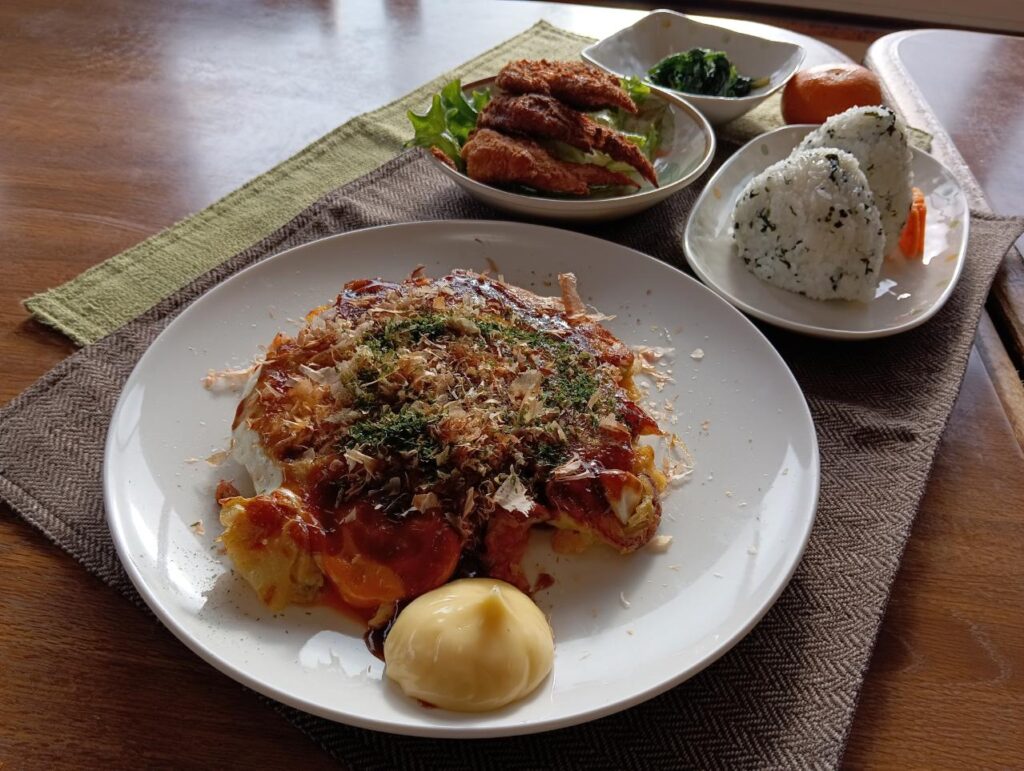 越冬キャベツのざく切りを入れて豚バラ肉を乗せて豚玉お好み焼きを作り