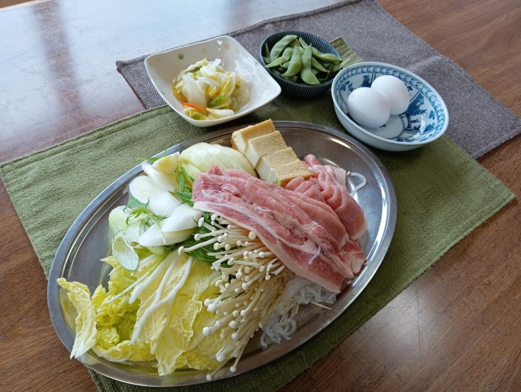 一人前300グラム超の北海道産豚ロースに白菜、白滝、玉ねぎ、鍋用長葱などの