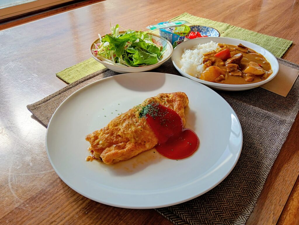 なんと!今日のわが家のメニューは、必殺!カレー風味のオムレツ定食なんです!カレーもいいけど、オムレツもいいですよね!ちなみに昨日のメニューは、わかめごはんでしたよ(笑)