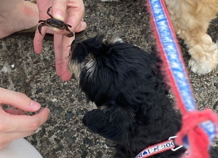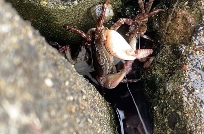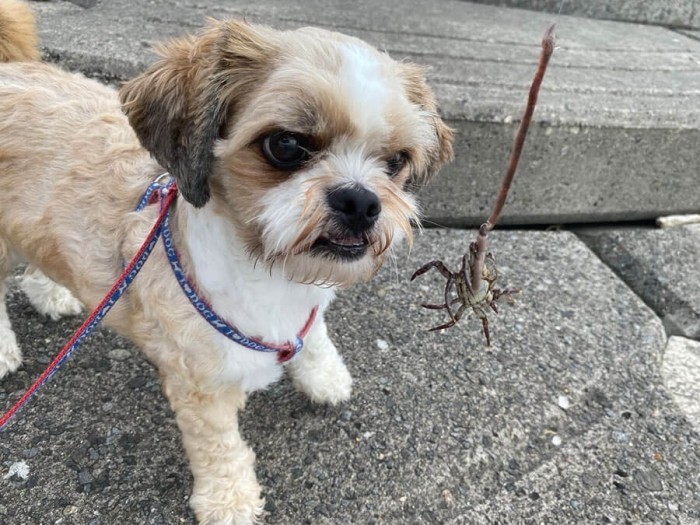 いつもの散歩コースの海辺にカニ釣りに行ってみたよ。