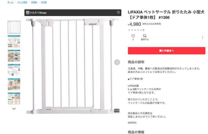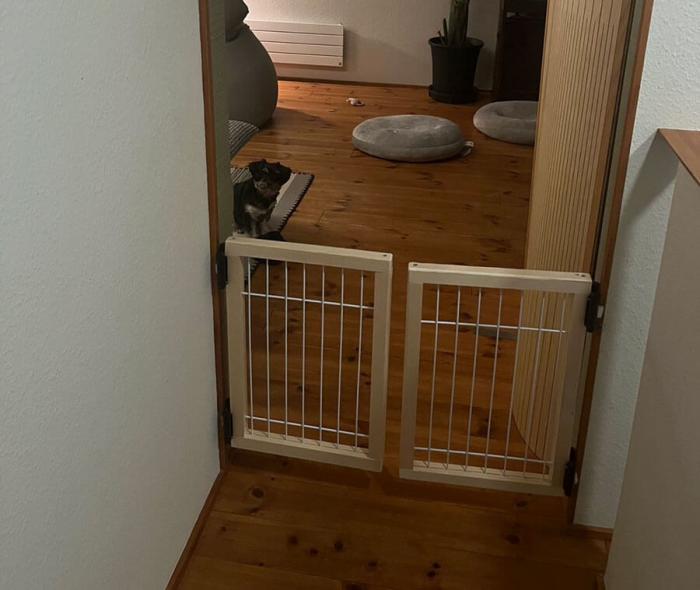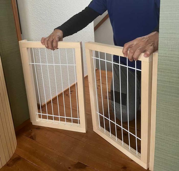 階段の下り口にペット用ケージの壁を