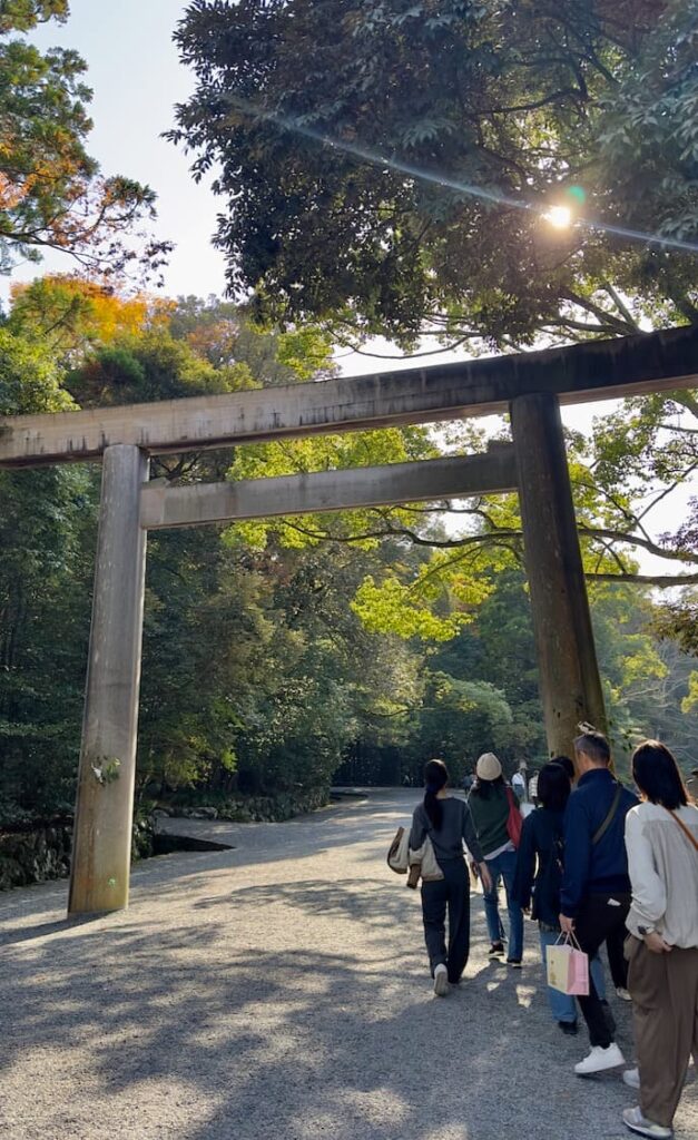 ユルユルの伊勢うどんを食べてから、近くのバス停からバスに乗って10分くらい。観光客で満員になったバスは伊勢神宮内宮(皇大神宮)に到着した。内宮は天照大神を祀っている。