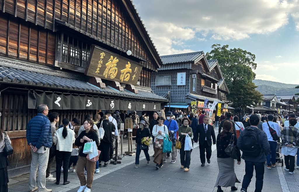 このおはらい町は江戸時代はお祓いや神楽をする下級神官の家が立ち並んで年間数百万人が訪れていたが、1970年代頃から車社会になると立ち寄る人が減り、一時は20万人くらいまでになってしまった。これを創業300年以上の「赤福」という会社の会長が140億円もかけて街並みを江戸時代風に整備し、おかげ横丁も1993年に開丁させ、見事に町を復活させたとのこと。今回もたくさんの人が訪れて賑わっている様子がみてとれた。