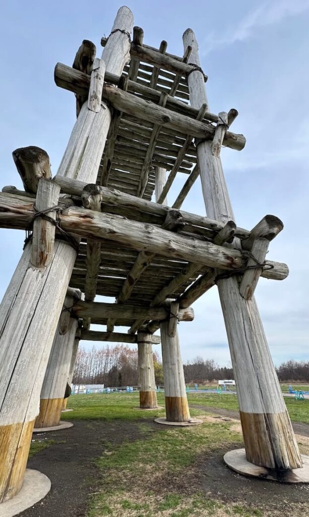 発見された穴の大きさと残されていた栗の木の痕跡から高さ15mほどの柱を持つ建造物があったと思われる遺跡だが、一体何に使われたのか?当時の遠くの海まで見渡せるくらいの高さだったことから、海上交易に使われたものかもしれない。