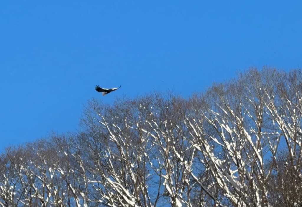 彼らは雪とともにやってくる。お目当てはサケであろう。しかし雪で白くなった山はウサギなどの小動物も上からよく見えるはずだ。もう何羽か見ることができるだろうか。