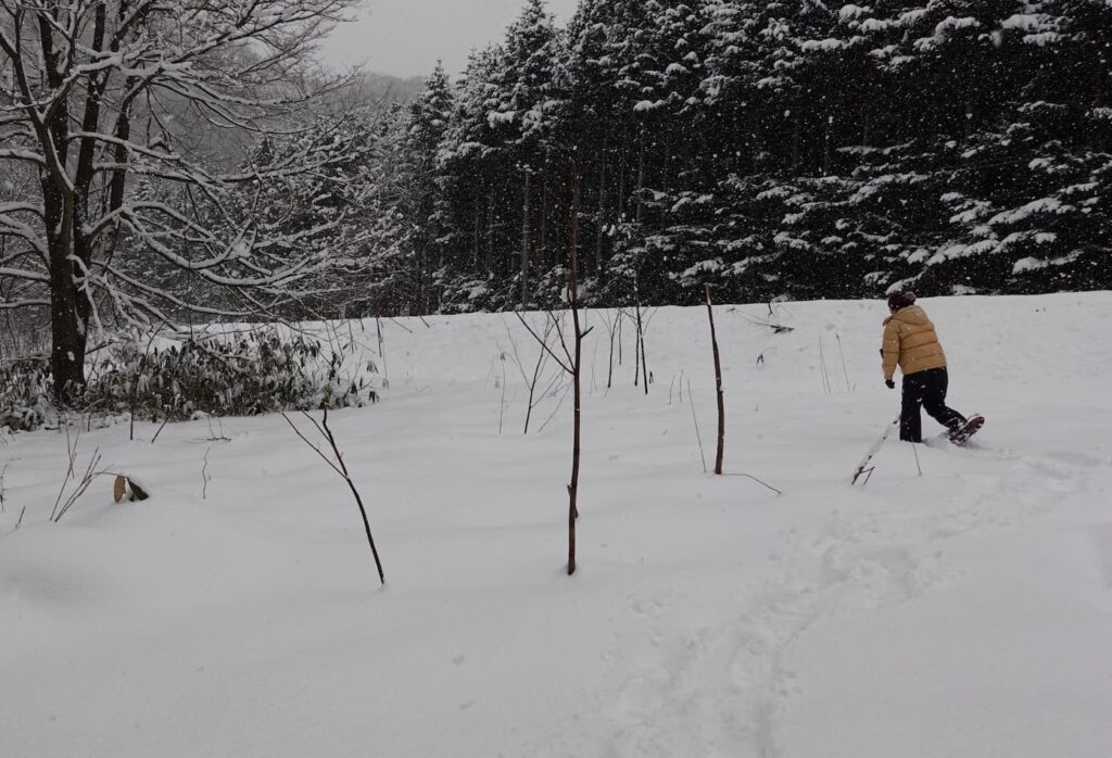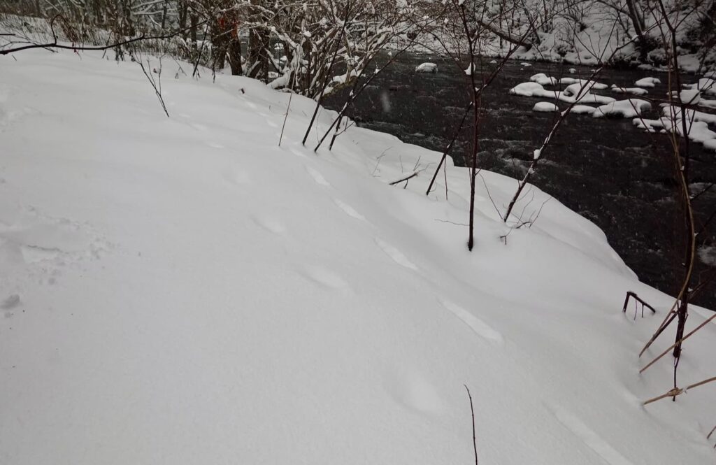 少し上流に行くと道路から貫気別川まで、夏の間は熊笹などで人を閉ざしている。しかし、冬になって積雪すると、川沿いまで簡単に行ける。先シーズンに準備した2つのスノーシューが今シーズンやっと出番となったのだ。