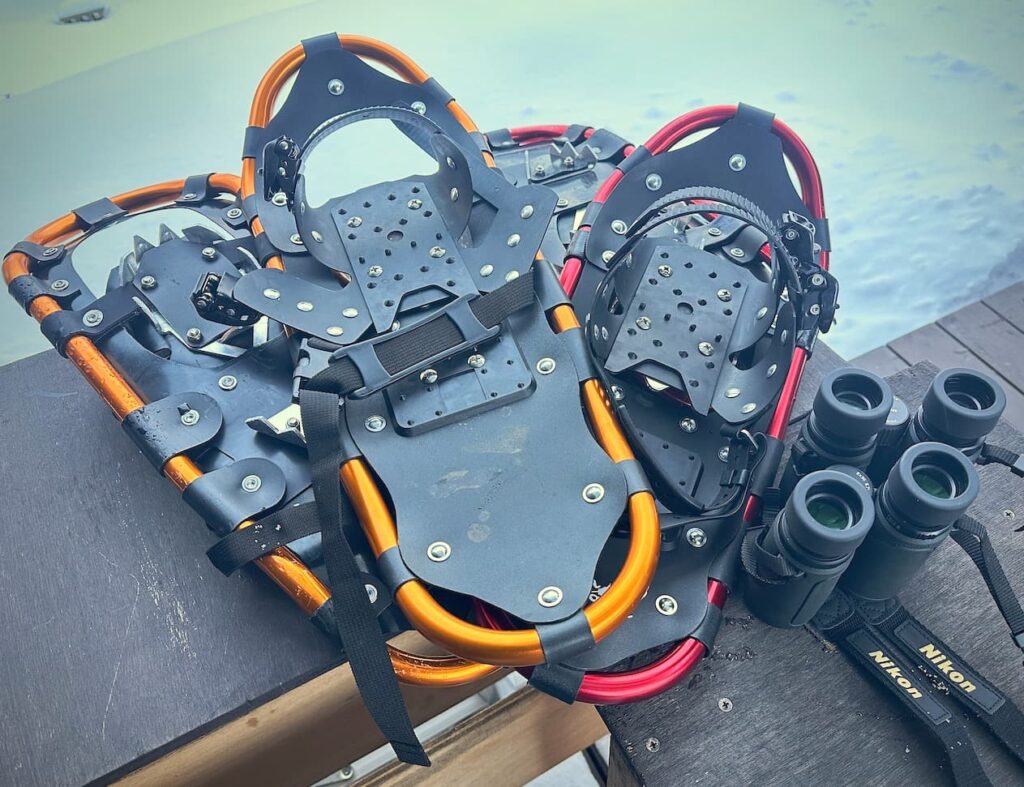 スノーシューは、つまり「かんじき」だ。体重を分散させるから膝上まである積雪でも雪に潜らないくらいで歩ける。まあそれも雪質にもよるが・・・。