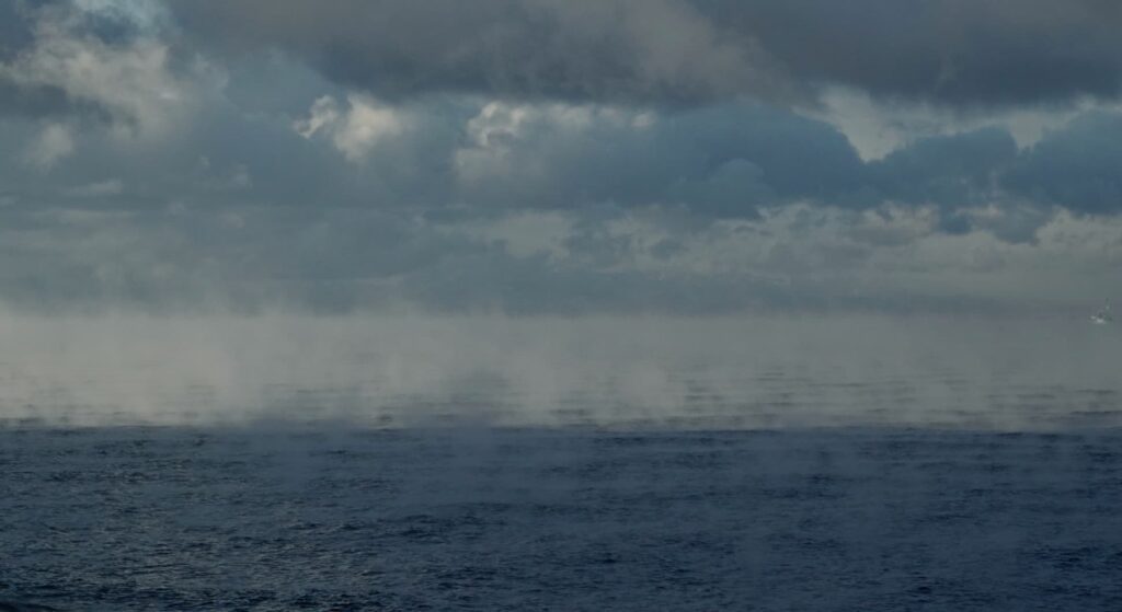 そんな今朝、居間から見える海には朝日と共に気嵐が立っていた。