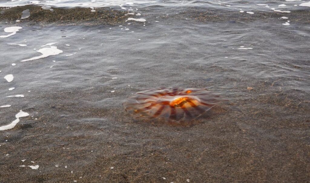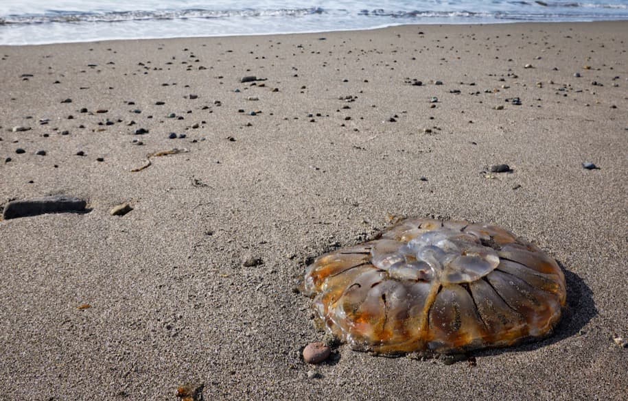 このクラゲの寿命は1年足らず。その間、これほど大きな体を持ちながらも、ただ海中を漂うだけだ。そして最後は、こうして浜辺に打ち上げられて果てる。