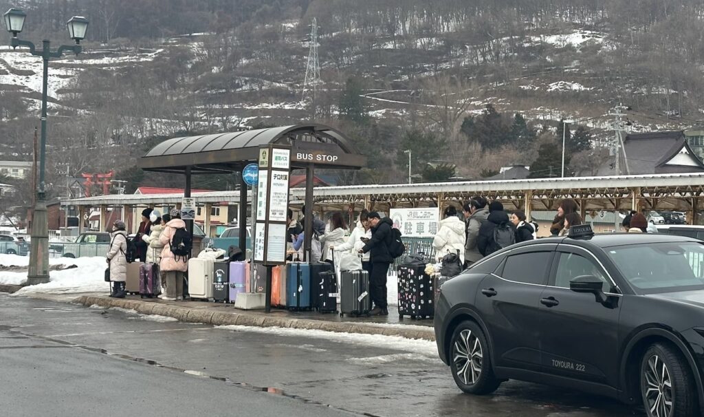 JR洞爺駅前のバス停にはアジア系観光客が温泉行きバスを待って並ぶ