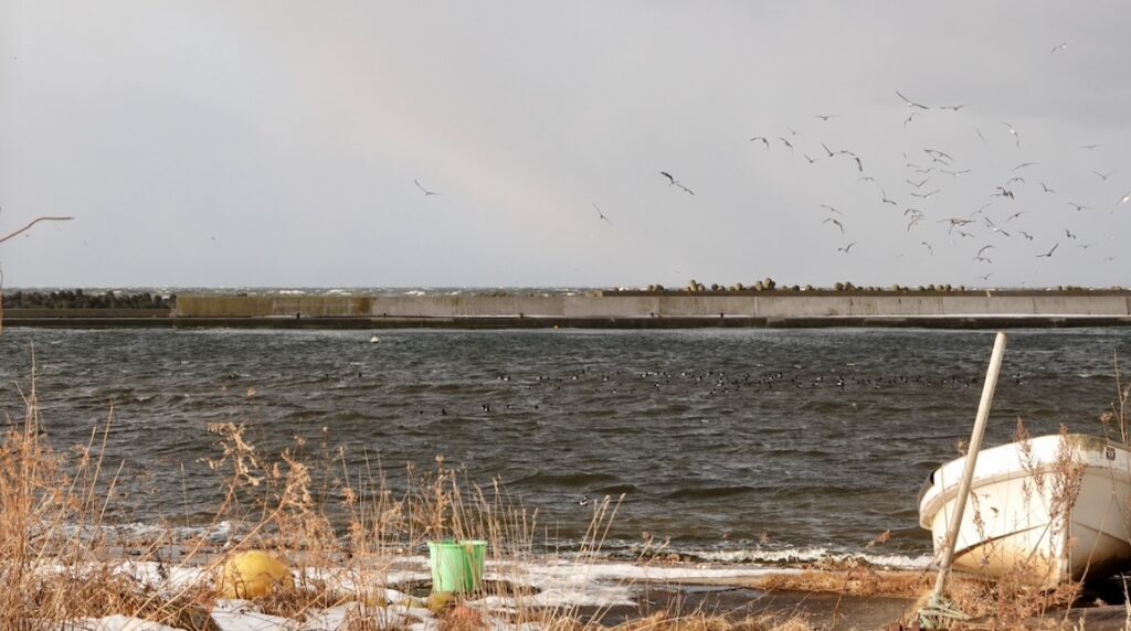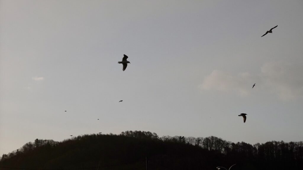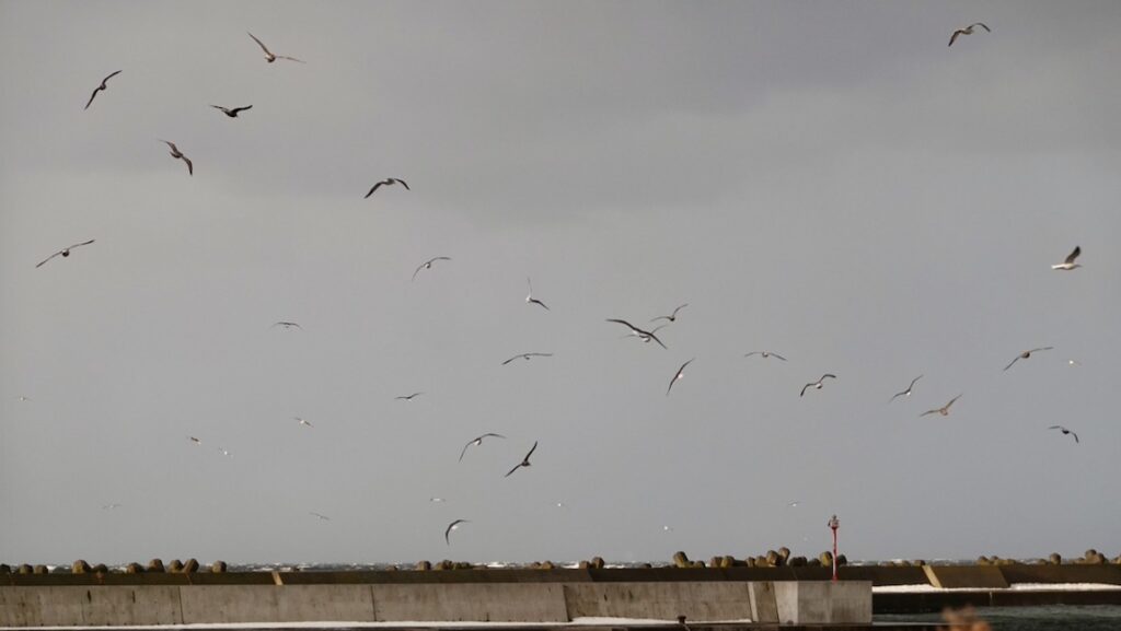 すると西の方から港の方へ、ウミネコたちが一斉に群れをなして飛んできた。100羽以上いるだろうか。