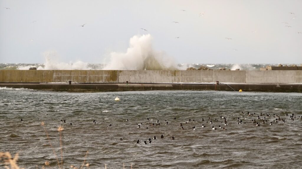 なんでこんな日に鳥たちは集まるのか?どうにも合点が行かないなと思ってカメラを構えていたら、防波堤に荒波がドドーン!という轟音を立ててぶつかり、波飛沫を空に高く舞い上げた。