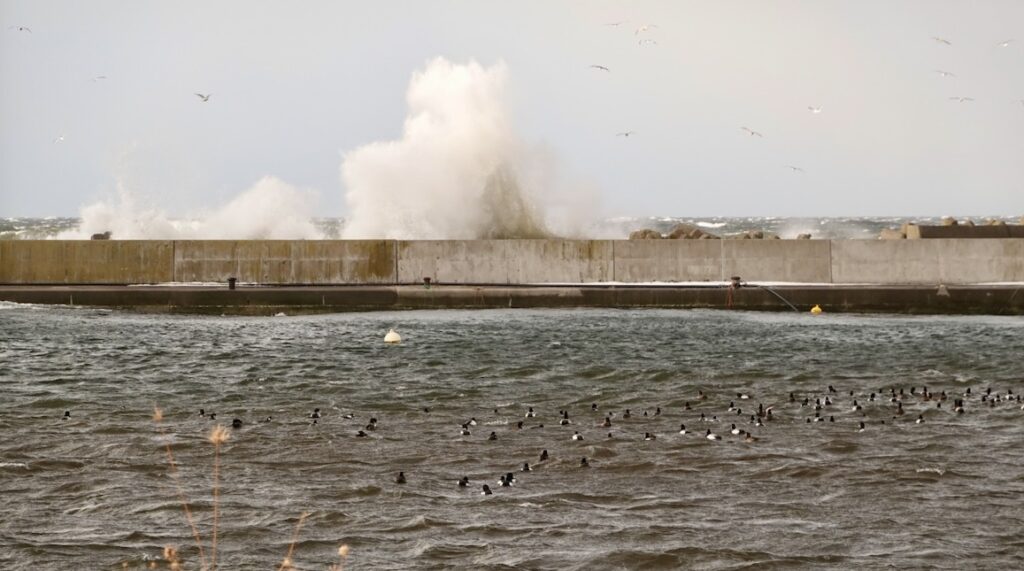 よく見ると、港内には水鳥たちもたくさん集まり、みんなで波間をプカプカと浮遊しているではないか。まさかこういう状況で、エサとなる魚たちを取りやすくなるわけでもあるまいが・・・。