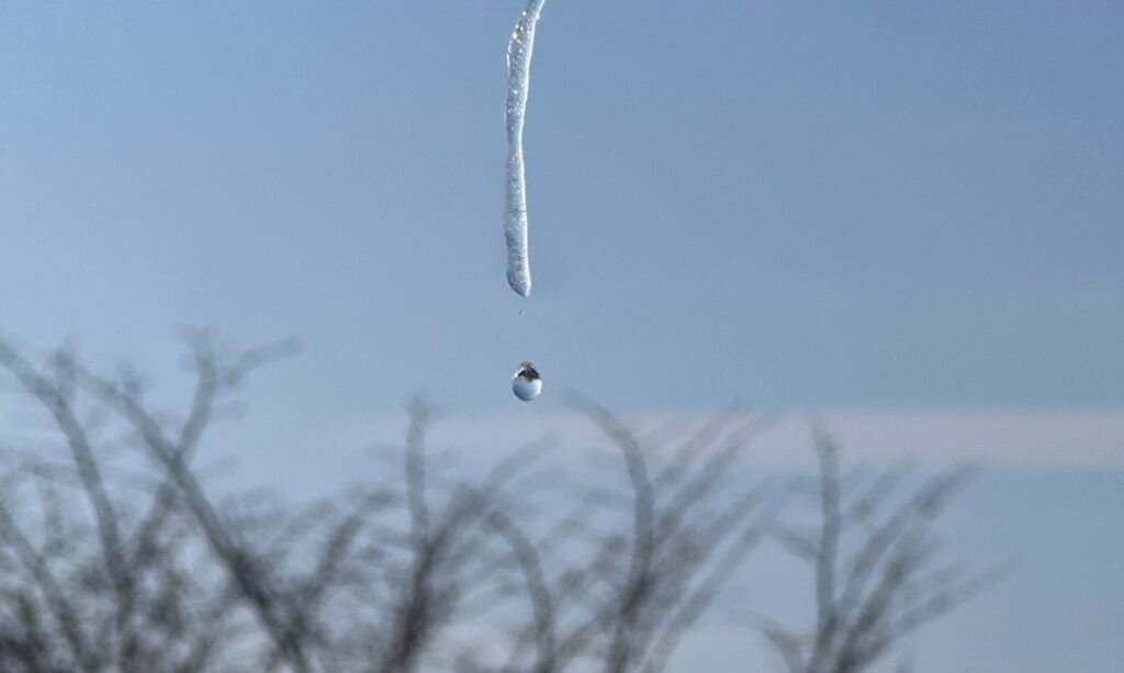 氷柱の水滴が外の世界を映しながら、次々と落ちていく。