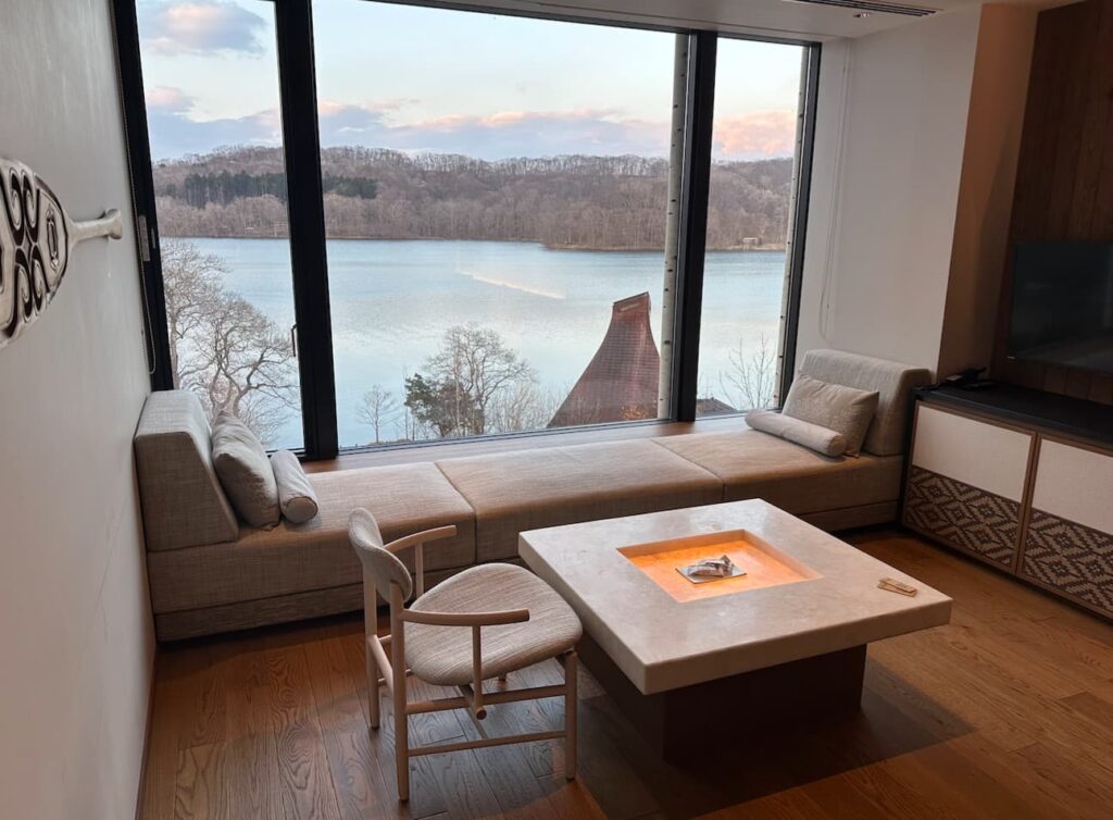 星野リゾートが提供する「界」というブランドは、「ご当地の魅力に出会える温泉旅館」というコンセプトとなっている。全国に22施設あるようで、北海道には白老の民族共生象徴空間「ウポポイ」のあるポロト湖畔の対岸に建っている。建物はニセコに多くあるホテル風のコンドミニアム風であるが、全室ポロト湖畔に面した大きな窓があり、とても開放感のある部屋となっている。