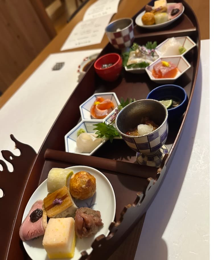 夕食はグループごとに仕切られた半個室でゆっくりととる。オーソドックスな小鉢が続いて出てきてお腹もいっぱい。大満足。