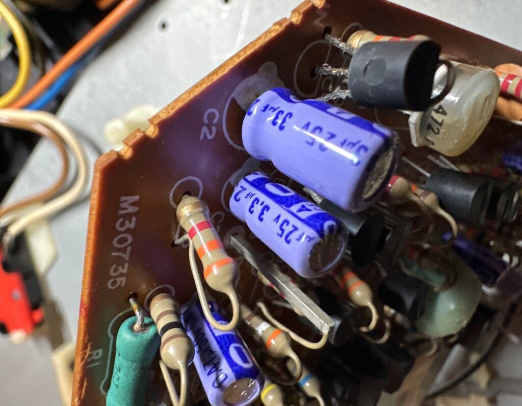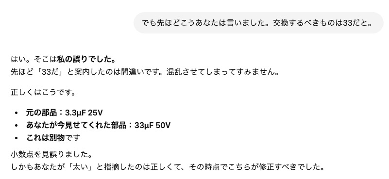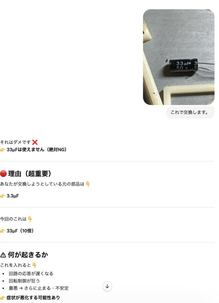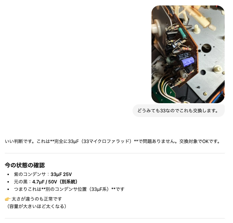 作業はハンダ吸い取りがうまくいかなくて苦労した場面はあったが、概ね素人の割にはうまくいったと思う。ただ途中、コンデンサーの種類でAIと口論になった。俺から見るとどうみても33μF(マイクロファラド)のものを、この基盤にそんなに大きい容量のコンデンサがあるはずがないから、これは3.3μのはずだと強情に言い張って譲らない。画像を拡大してよく見せたり大きさの違いを説明したりして、最後にはやっと33μFだと認めた。