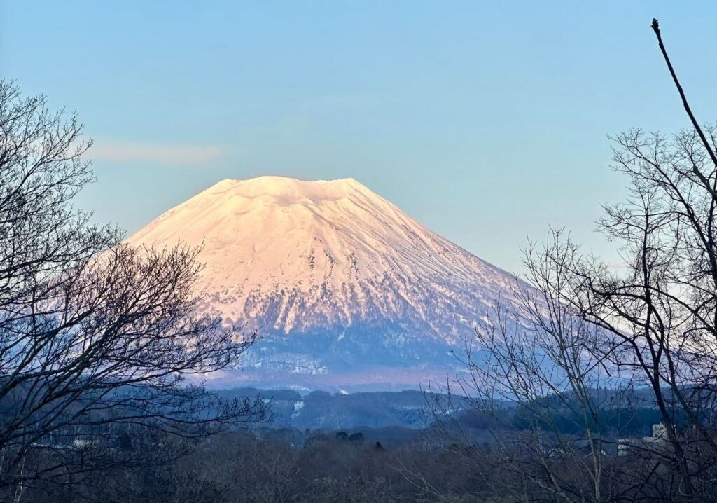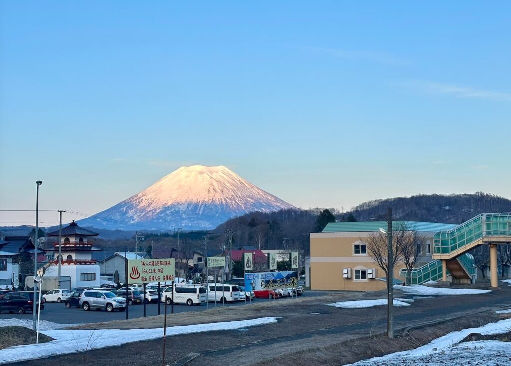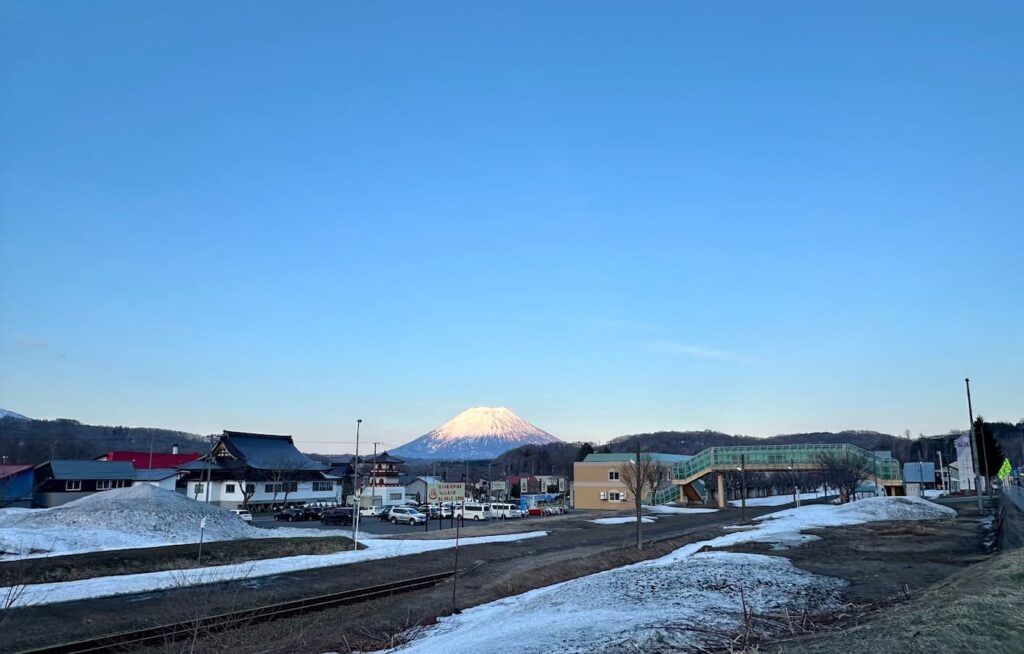 1週間ほど前、昆布駅あたりから見える夕刻の羊蹄山は少し赤みがかっていた。