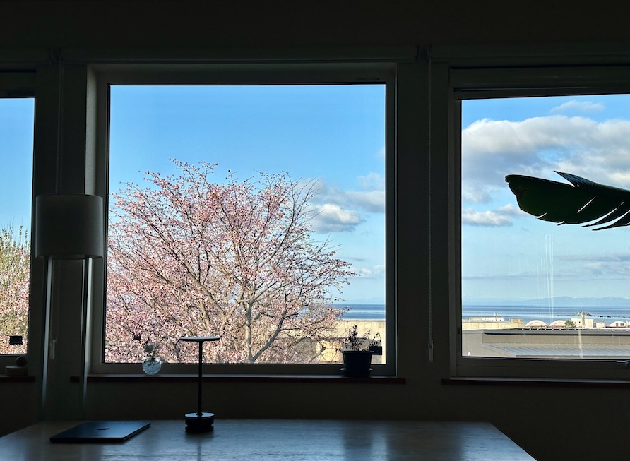 雪が解けて花木が目を覚まし、居間から見る桜も5分、7分咲きになった。