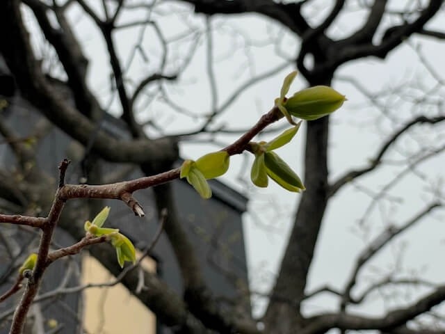 ※ 写真は庭にある柿の樹に新しい葉っぱが出始めたんで