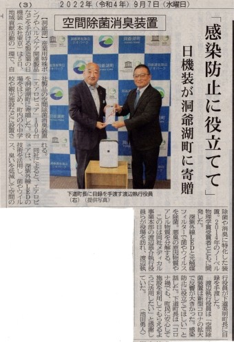 産業用特殊ポンプ、人工透析機器では、国内トップシェアの日機装(6376証券コード)様から、地域貢献活動の一環で、空間除菌消臭装置・エアロピュアを、なんと100台寄贈して頂きました。