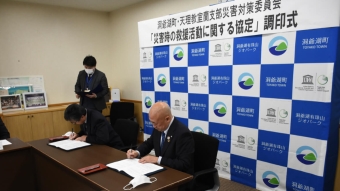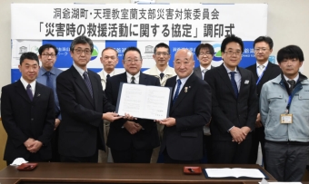 天理教災害救援隊と洞爺湖町で、「災害時の救援活動に関する協定」で調印式.